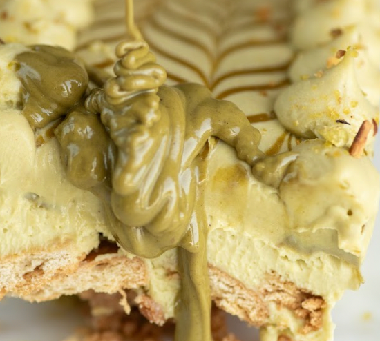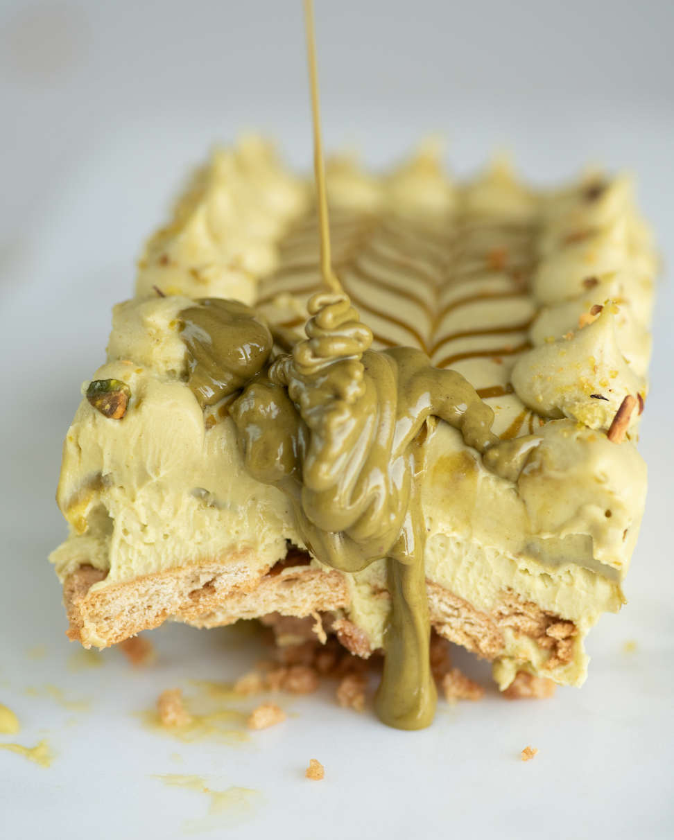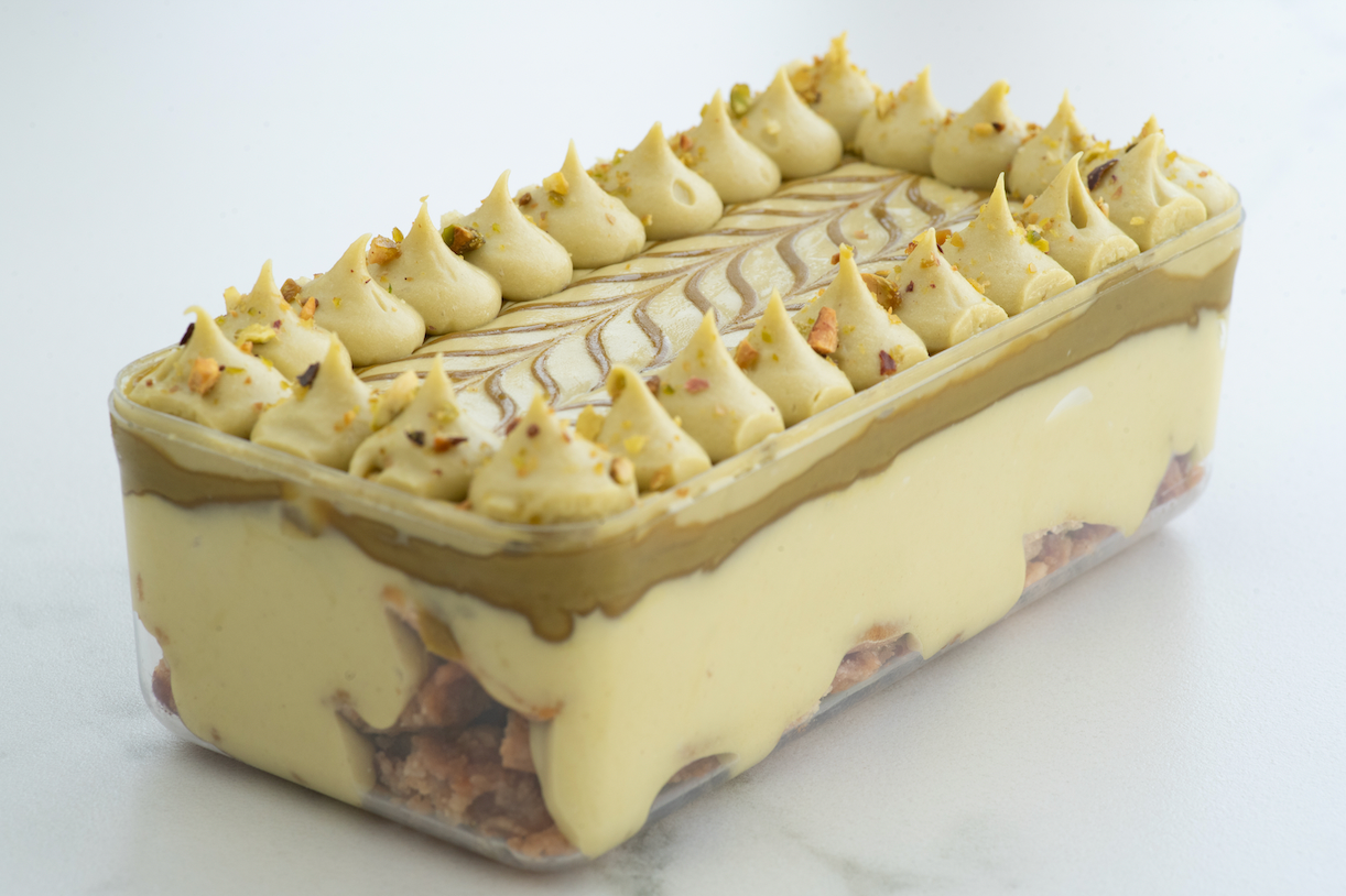 Layers of velvety pistachio ganache, Maria cookies, our signature crunchy almond crumble, pistachio chunks, and a delectable praline drizzle for a delicately smooth yet delightfully crunchy experience.