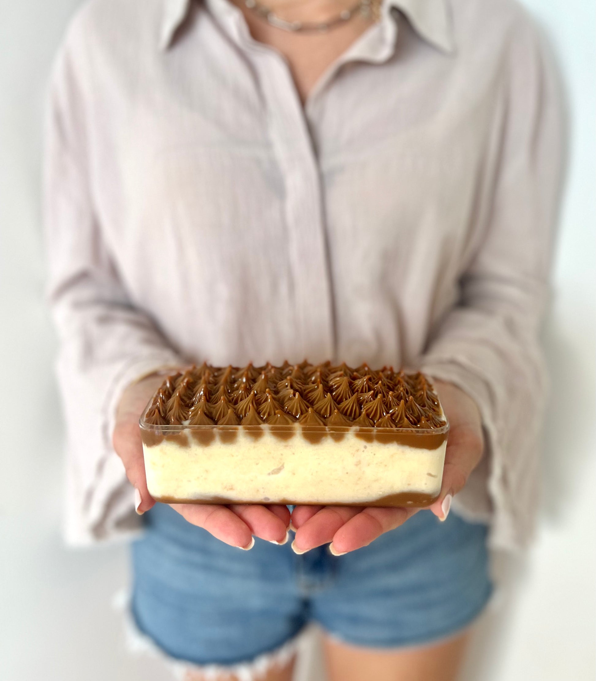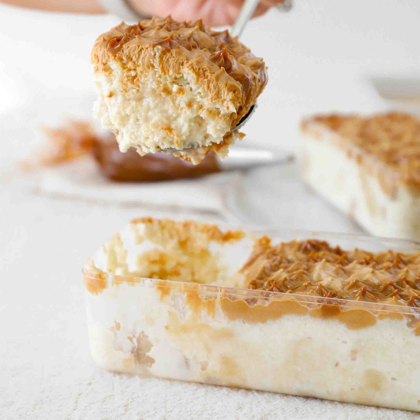Ultra-light and moist sponge cake soaked in a silky blend of three milks filled with surprising spots of dulce de leche and topped with more dulce de leche.